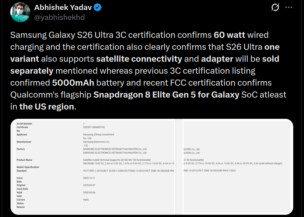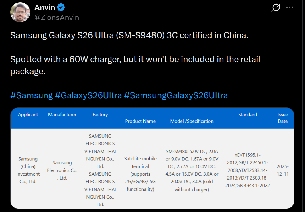 Samsung Galaxy S26 Ultra (SM-S9480) Receives China’s 3C Certification: 60W Wired Fast Charging and Satellite Connectivity Revealed
