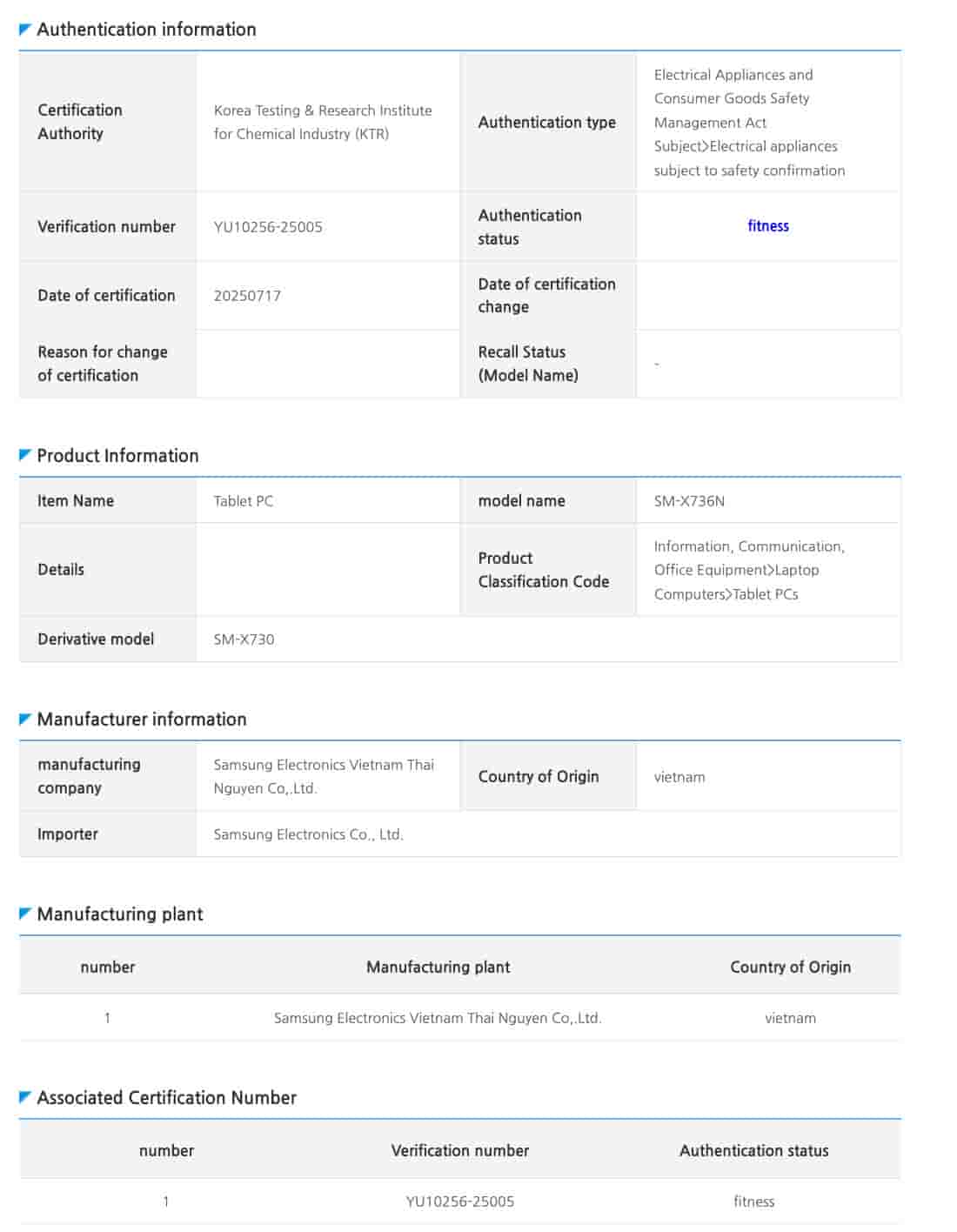The Samsung Galaxy Tab S11 5G tablet that carries the model number of ‘SM-X736N’ (South Korean variant) has been certified by the Safety Korea authority, and it has received the certification with the verification number of ‘YU10256-25005’. As mentioned, the live image of the device has also been listed on the certification database, and it has been categorized as a ‘tablet PC’. Also to add, the WiFi-only version that has the model number of ‘SM-X730’ has been mentioned as the derivative model.