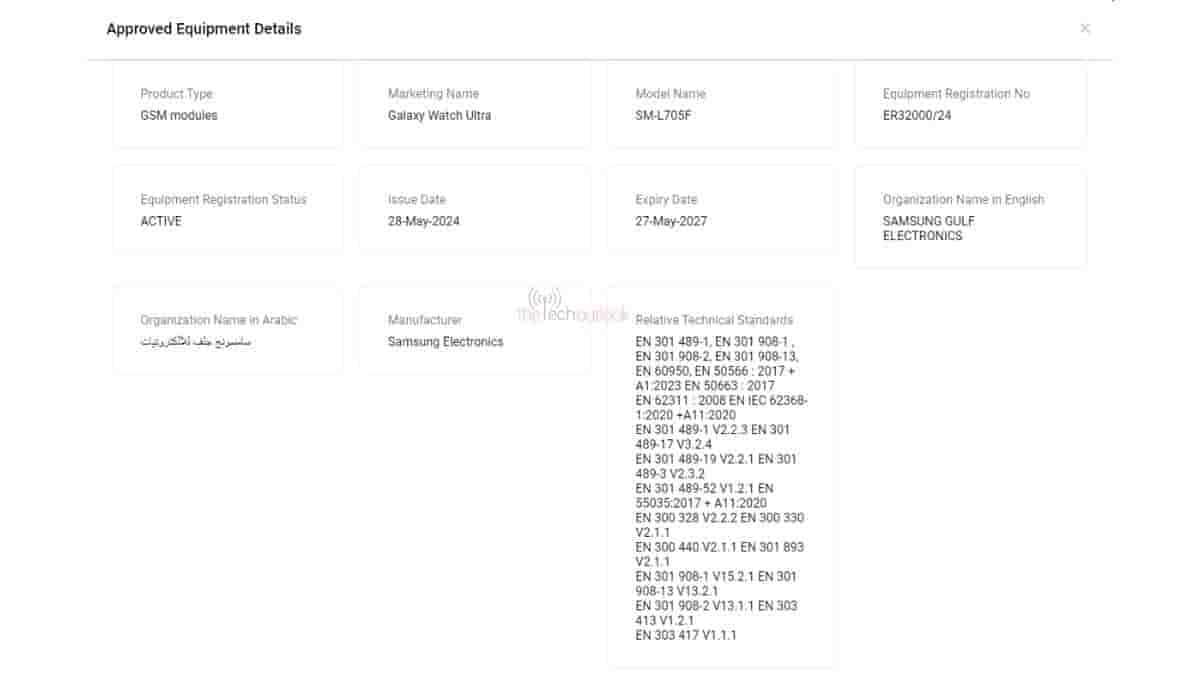 The listing on the TDRA reveals that the model number “SM-L705F” will carry the moniker Galaxy Watch Ultra. Under the product type, it is listed as a GSM module, hinting that it will have cellular connectivity. Unfortunately, it doesn’t provide information on whether it will support 5G or only LTE. Beyond this, the certification does not offer much additional information.