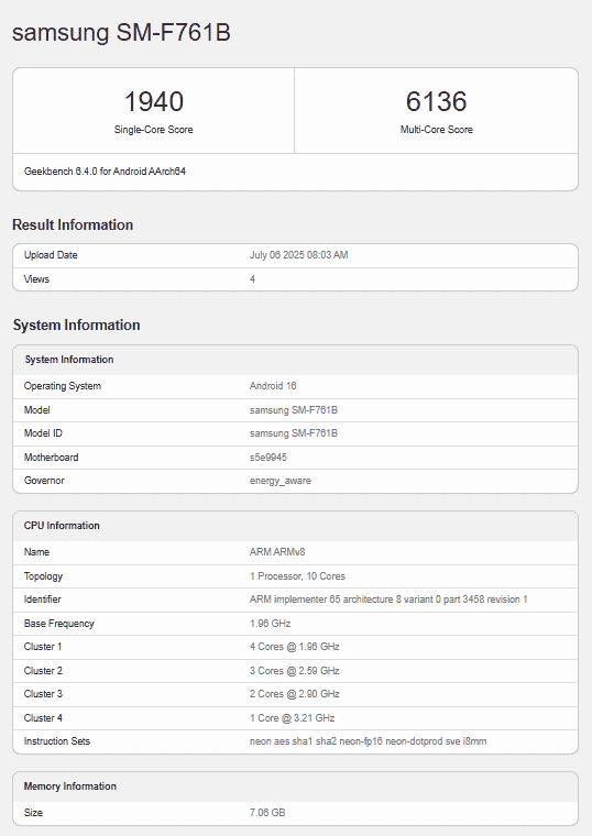 Samsung Galaxy Z Flip 7 FE (Global Variant) – Geekbench Listing