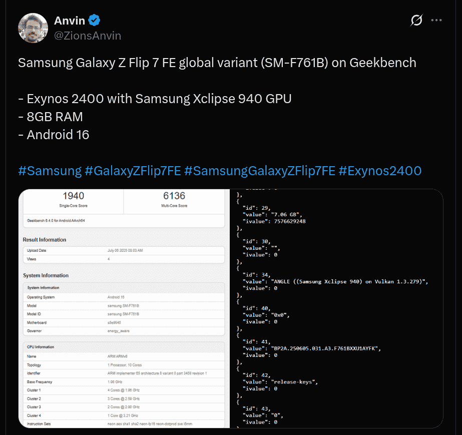 Samsung’s Galaxy Z Flip 7 FE smartphone global variant which carries the model number of ‘SM-F761B’ has been listed on the Geekbench database, and it has achieved 1940 points on the single-core test and 6136 points on the multi-core test. As mentioned, a few key specs of this upcoming device have again been revealed via the Geekbench listing, and the revealed specs include the Exynos 2400 chip, Xclipse 940 GPU, Android 16 OS (probably with One UI 8 on top), and 8GB RAM. [Just to add, the South Korean variant of the Galaxy Z Flip 7 FE was also previously spotted on the Geekbench database.]