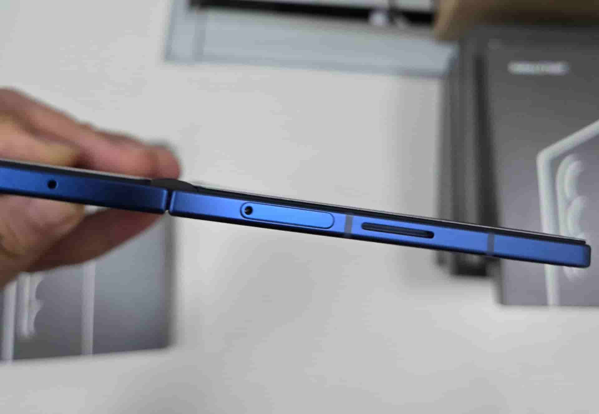 Moreover, the card tray seems to be at the top instead of being on the side, and at the left and right sides of it, a microphone hole and speaker unit can also be spotted. This suggests that the upcoming Galaxy Z Fold 7 might also be offering a dual speaker system and multiple microphones. To note, the device on the leaked live images is the Blue color variant, and it also features antenna lines along the sides.