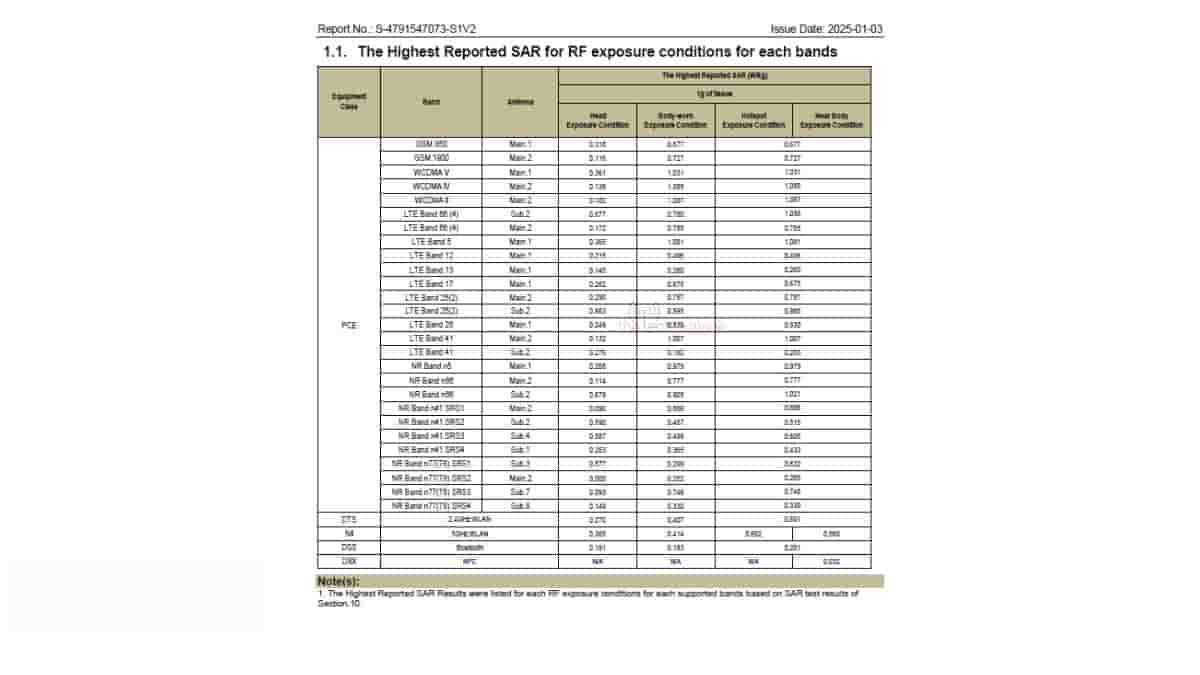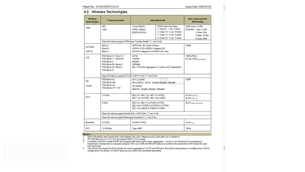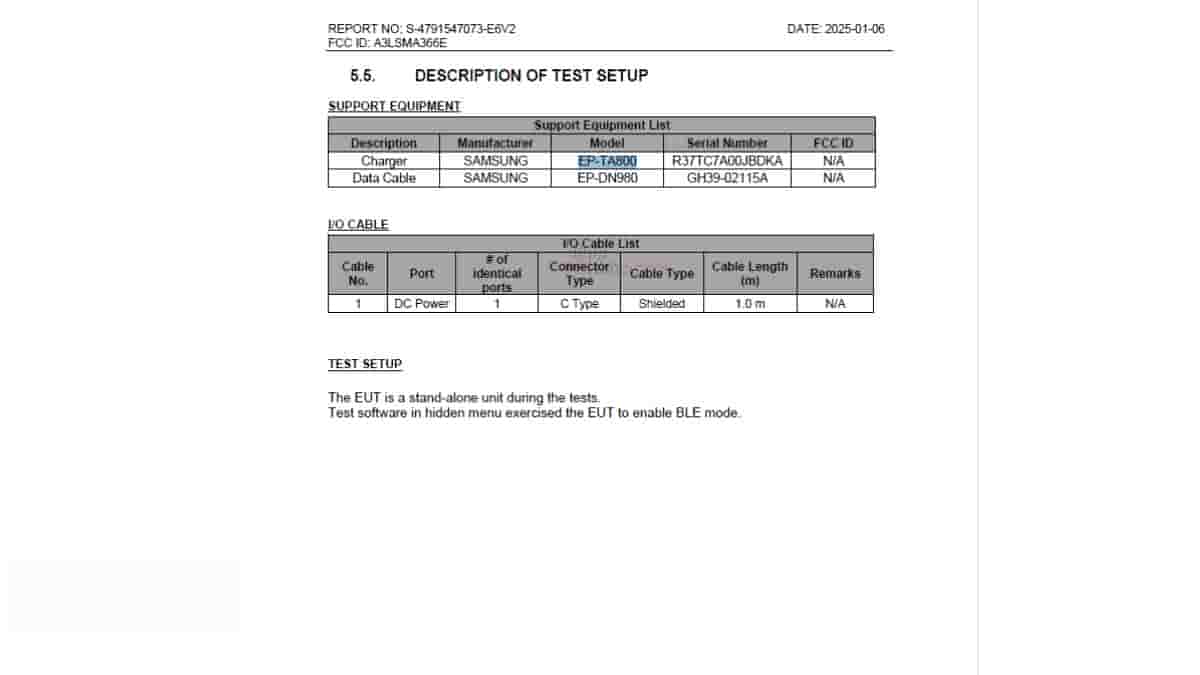 Speaking of the FCC-revealed key specs, the Galaxy A36 5G is going to support connectivity specs like 5G/4G/3G/2G network, WiFi 6 with 2.4GHz and 5GHz dual band support, Bluetooth 5.4 (with BLE technology – Bluetooth Low Energy, 2.4 GHz), and NFC (13.56 MHz). Furthermore, the device has also been listed with a Samsung ‘EP-TA800’ charger and Samsung ‘EP-DN980’ data cable. This suggests that just like its predecessor, the upcoming Galaxy A36 5G may also be supporting a 25W wired fast charging feature. [However, the TUV Rheinland listing mentioned a possible 45W wired charging support.] The data cable is also revealed to be one meter in length with a USB Type-C connector.
