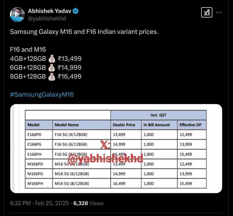 This update comes from the X tipster @yabhishekhd and as per the details shared, both the Galaxy M16 5G and Galaxy F16 5G devices will be made available to Indian customers in 4GB/128GB, 6GB/128GB, and 8GB/128GB storage options. About the pricing details, the two will share the same price points of INR 13,499, INR 14,999, and INR 16,499 (~ dealer price) for the 4GB/128GB, 6GB/128GB, and 8GB/128GB storage variants respectively. Also, the effective discount prices are suggested to be INR 12,499, INR 13,999, and INR 15,499 for the three storage models, following the INR 1,000 discount.