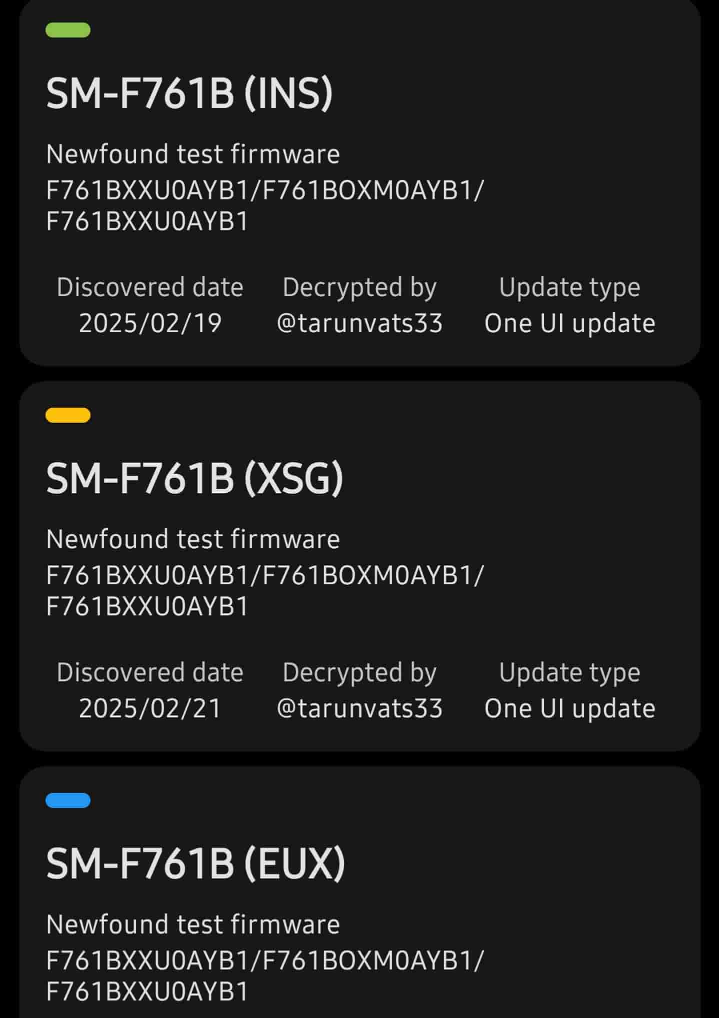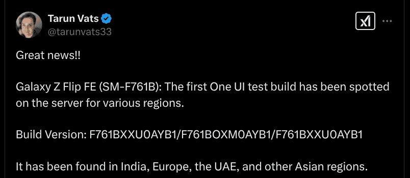 The Samsung Galaxy Z Flip FE device which is believed to carry the model number – ‘SM-F761B’ is currently in works and the first One UI test build of this upcoming smartphone as mentioned has been spotted. It has been listed on the official servers in India, Europe, UAE, as well as in certain other Asian regions. The build version of the test build is ‘F761BXXU0AYB1 / F761BOXM0AYB1 / F761BXXU0AYB1’.