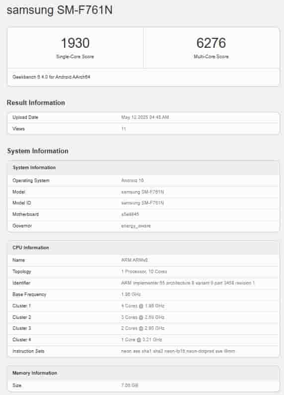 The upcoming Samsung Galaxy Z Flip FE smartphone model with the model number – ‘SM-F761N’ has appeared on the Geekbench database, and it has attained 1930 points and 6276 points respectively on the single core and multi-core tests. Furthermore, the Geekbench listing reveals that Samsung’s Galaxy Z Flip FE will possibly have the Android 16-based operating system out of the box, and it will be powered by a Samsung Exynos chip with motherboard codenamed – ‘s5e9945’ and clocked at 3.21 GHz. It will be integrated with the brand’s own Xclipse 940 chip and will offer an 8GB RAM variant.