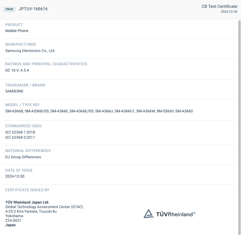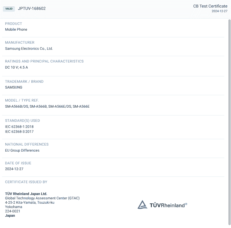 The Galaxy A26 5G (‘SM-A266B/DS’, ‘SM-A266B’, ‘SM-A266M/DS’, & ‘SM-A266M’), Galaxy A36 5G (‘SM-A366B’, ‘SM-A336B/DS’, ‘SM-A366E’, ‘SM-A366E/DS’, ‘SM-A366U’, ‘SM-A366U1’, ‘SM-A366W’, ‘SM-S366V’, & ‘SM-A3660’), and Galaxy A56 5G (‘SM-A566B/DS’, ‘SM-A566B’, ‘SM-A566E/DS’, & ‘SM-A566E’) smartphone models have made it to the TUV Rheinland certification platform, with respective certification numbers of ‘JPTUV-168885’, ‘JPTUV-168616’, and ‘JPTUV-168602’.