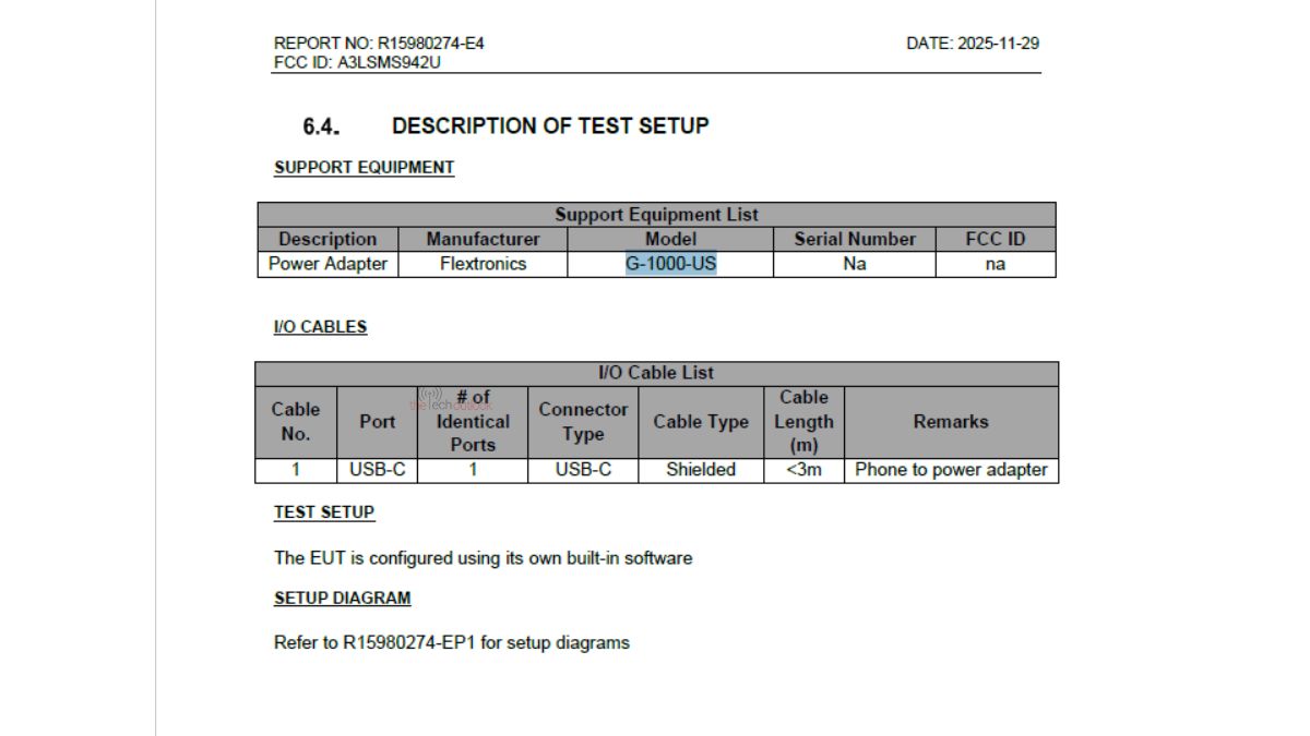 The listing also confirms Wi-Fi operation across the 2.4GHz, 5GHz, and 6GHz bands, along with Bluetooth LE and NFC support. In addition, testing has been recorded for NTN (satellite) band n255, which suggests that satellite connectivity support could be present on the device. The accompanying FCC test setup documentation further reveals that testing was conducted using a Flextronics G-1000-US power adapter connected via a shielded USB-C cable.
