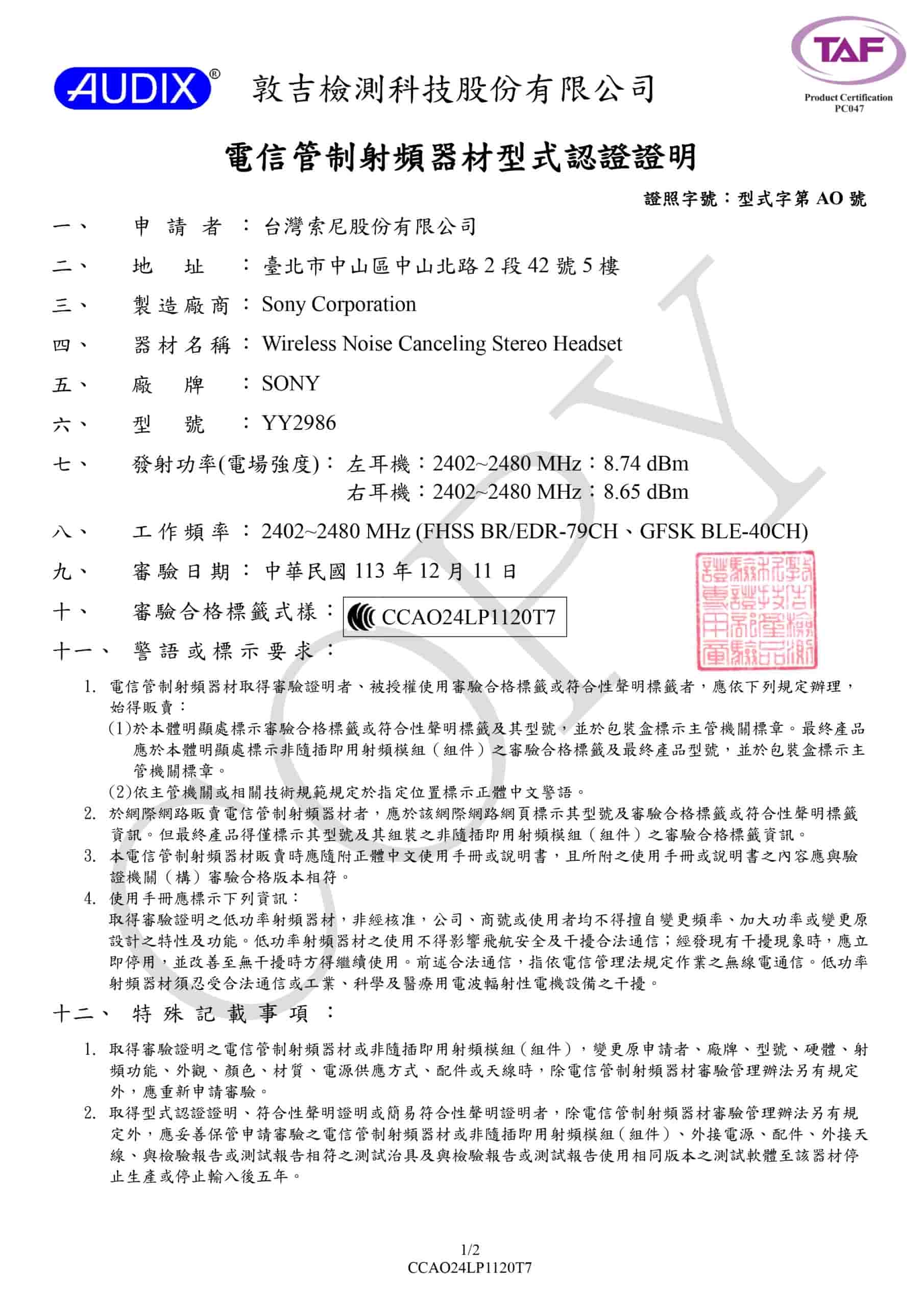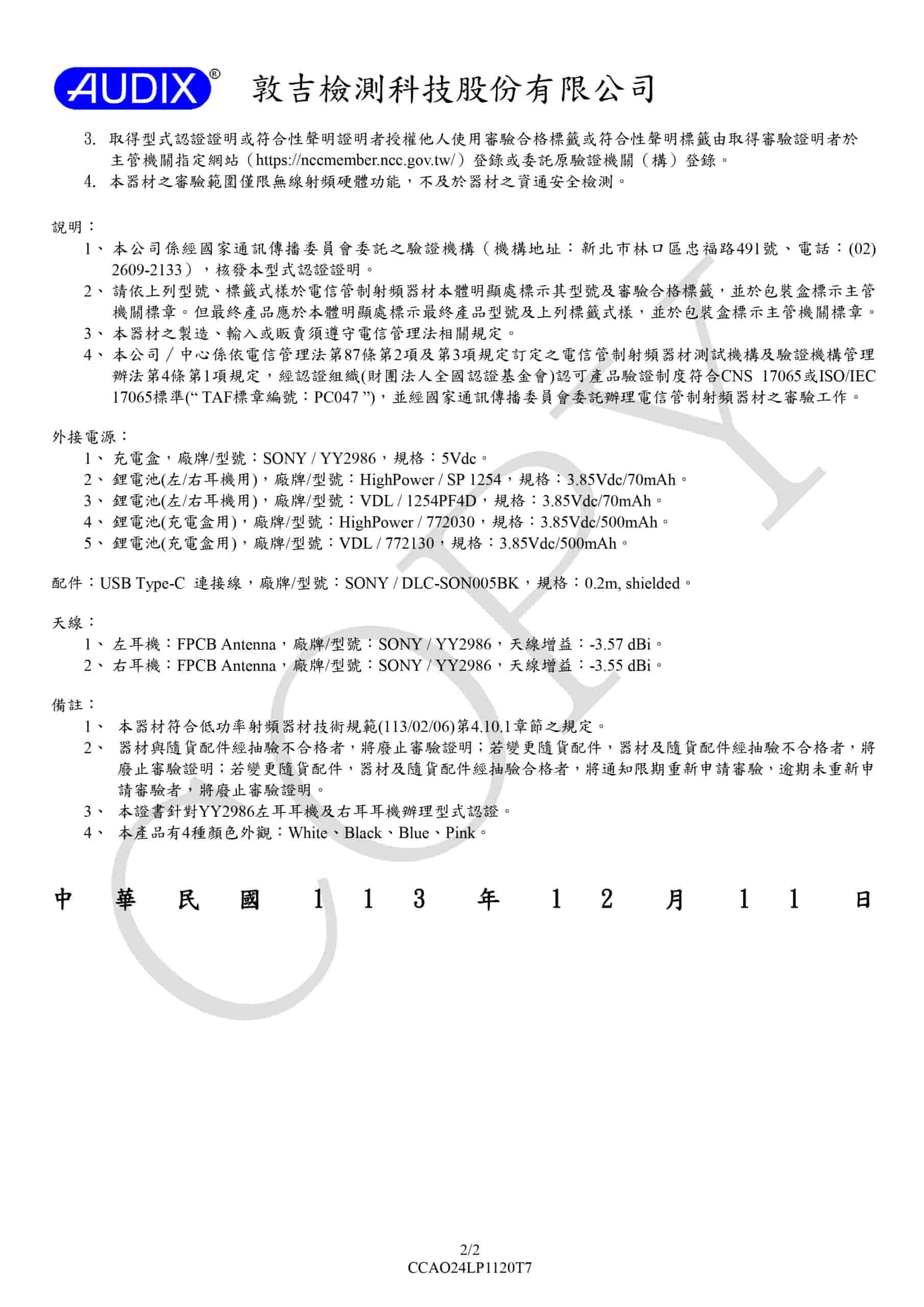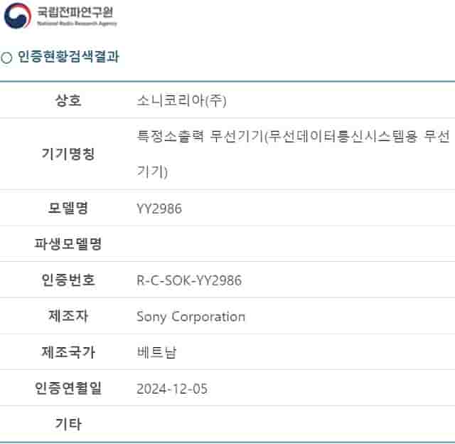 The Sony ‘YY2986’ earbuds has received the AUDIX certification and has been listed on the database as a wireless noise-cancelling stereo headset. Its working frequency is ‘2402~2480 MHz (FHSS BR/EDR-79CH, GFSK BLE-40CH)’, with transmission power (electric field strength) of 8.74 dBm and 8.65 dBm respectively on the left and right earphones. The antenna gain strength on the left and right earphones are also -3.57 dBi and -3.55 dBi respectively.