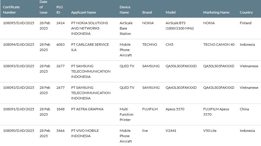 Apart from Tecno Camon 40 4G, Vivo V50 Lite 4G with model number V2441 was also spotted on the SDPPI database. Previously this device also made its appearance on EEC, Bluetooth SIG, and FCC certification websites. A few of the key specs revealed via the FCC database include – dimension of 163.96 x 75.3 x 8.495 mm, weight of 193 gm, 6500 mAh typical battery (6380 mAh rated battery; model number – BA93), likely 90W fast charging (charging adapter with model number – V9082L0A1-US’; 1 meter USB cable), 2G/3G/4G network, WiFi 5 with dual-band support, Bluetooth (BR + EDR + BLE), NFC, GPS, GLONASS, BDS, Galileo, QZSS, SBAS, and 8GB/256GB storage option.