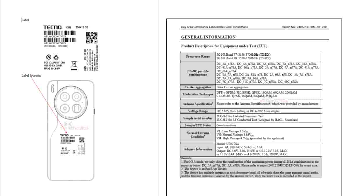 Tecno Camon 40 Premier 5G Appears on the FCC Certification Database: Few Key Specs and Design Revealed
