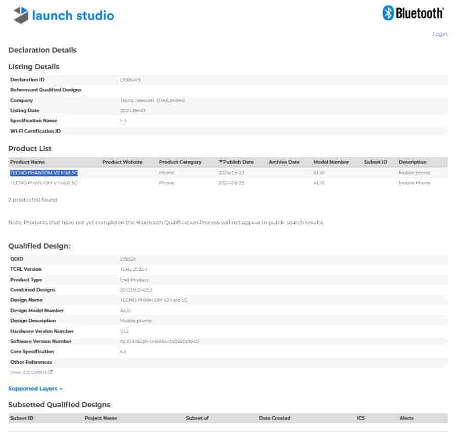 The above listing reveals the same model number with two different monikers- Tecno Phantom V2 Fold 5G And Tecno Phantom V Fold2 5G. It is confirmed that the upcoming device will be supporting Bluetooth 5.3 connectivity. Other than this no major detail regarding the device is revealed.