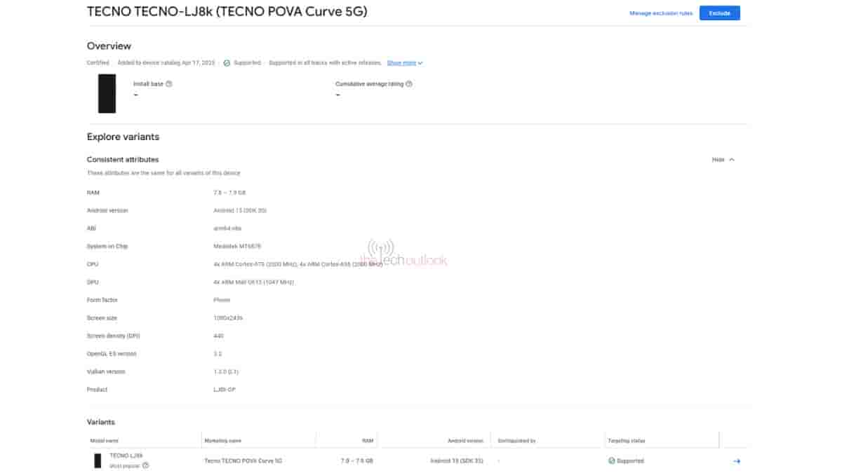 In addition, the Tecno Pova Curve 5G has been spotted on the Google Play Console, revealing some key specifications. The model number listed is LJ8k, and it carries the moniker Tecno Pova Curve 5G. The SoC is identified by the code MediaTek MT6879 with a Mali-G615 GPU (1047 MHz), which corresponds to the MediaTek Dimensity 7300 chipset. The CPU configuration shows four cores clocked at 2.5GHz and four cores at 2.0GHz.