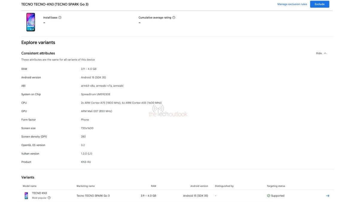 Tecno Spark Go 3 spotted on Google Play Console with Spreadtrum UMS9230E SoC, Android 15, and 4GB RAM