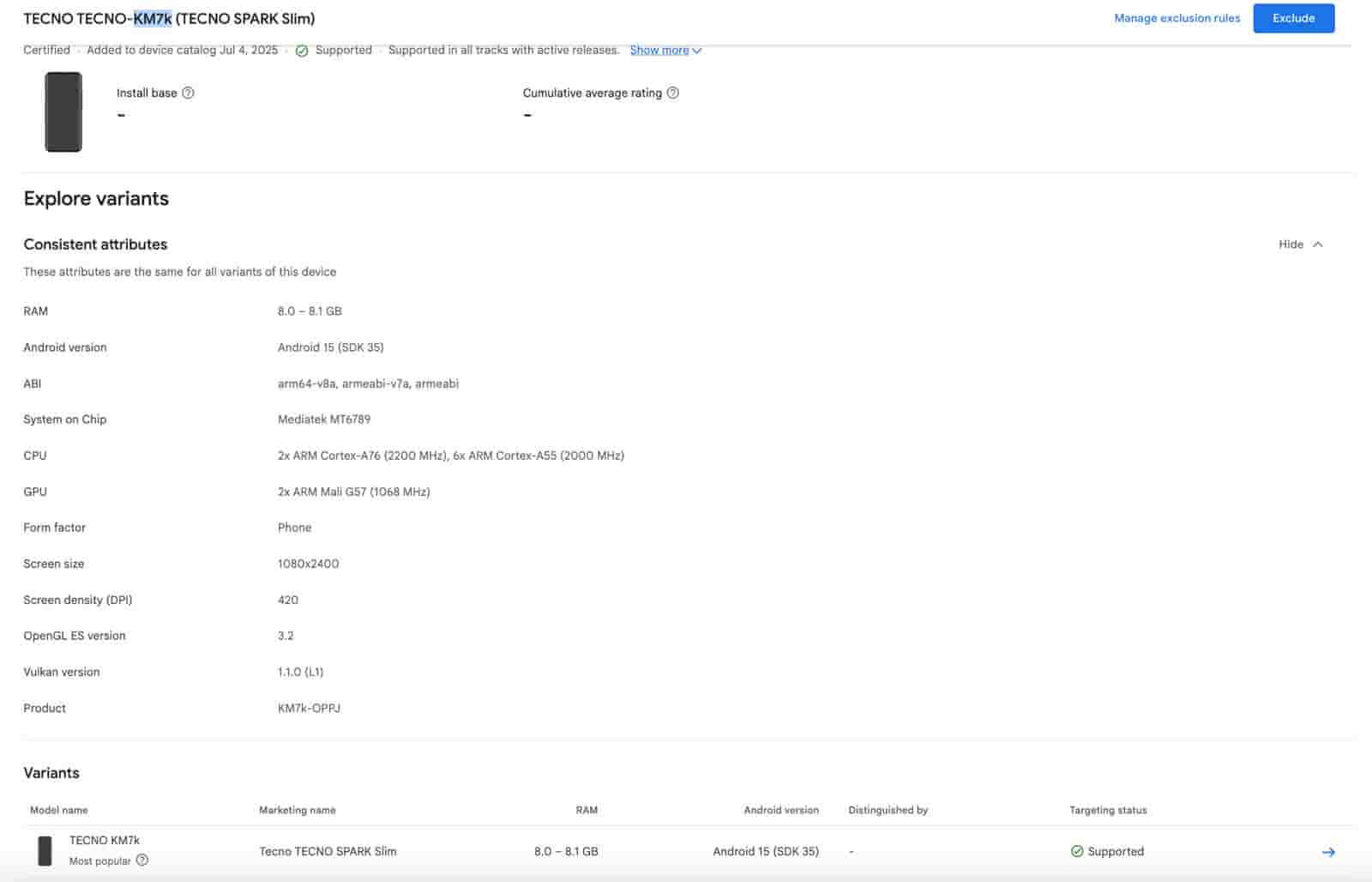 The Tecno Spark Slim smartphone with the model number of ‘KM7k’ has been spotted on the Google Play Console database and this is its 8GB RAM variant. As per its listing, it is pointed out with features such as the 2.20GHz-clocked MediaTek ‘MT6789’ octa-core processor, ARM Mali G57 GPU, Android 15 operating system, and 1080 x 2400 pixel resolution display (FHD+) with 420 DPI screen density. To note, while the chip details point to MediaTek’s Helio G99 processor, it is likely to come with either the Helio G100 or Helio G200 processors instead.