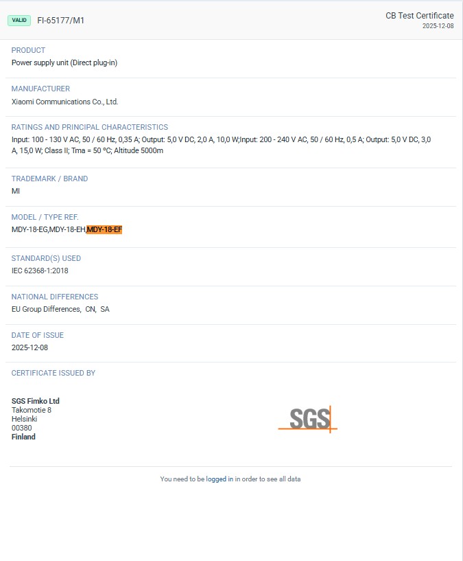 The charging adapter listed alongside these devices carries the model number “MDY-18-EF”. This charging adapter supports 15W (5V X 3A) fast charging, suggesting that both of these could be budget smartphones launched under the Redmi branding, especially since both model numbers carry the “RN” identifier. To further verify this, we also checked the SGS certification for the adapter, which likewise confirms 15W fast charging.
