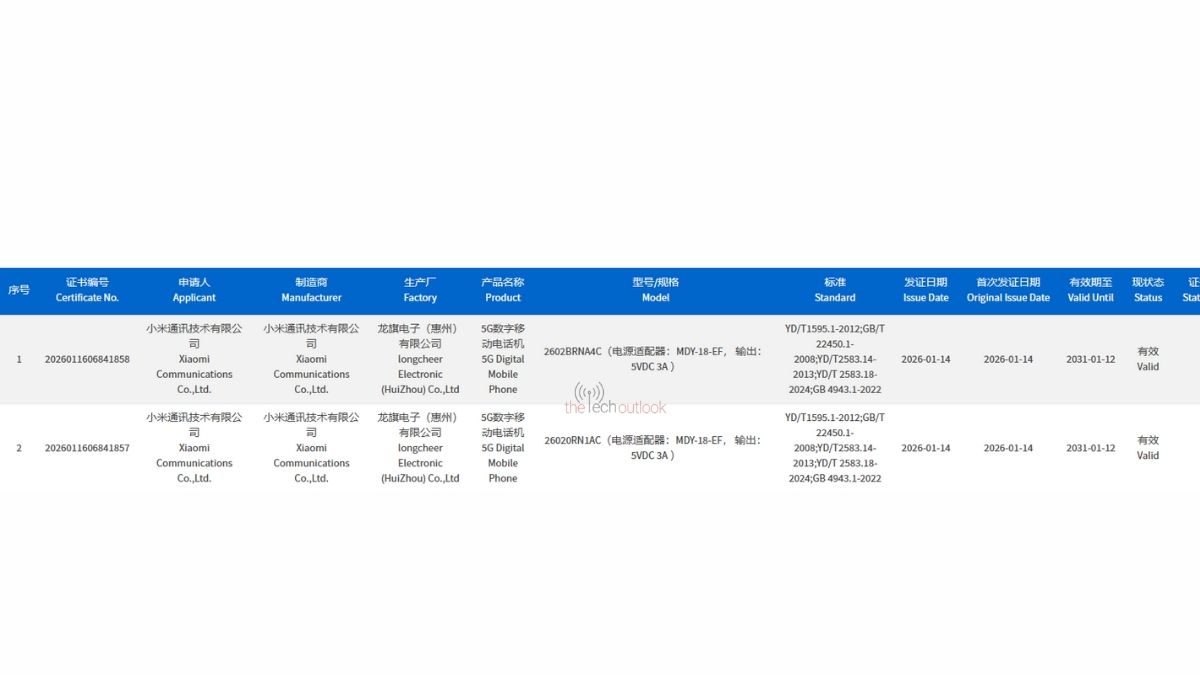 On the 3C certification, two model numbers listed are “26020RN1AC” and “2602BRNA4C”, and the certification number mentioned is “2026011606841858”. The listing also shows that both model numbers were approved on 14th January 2026.