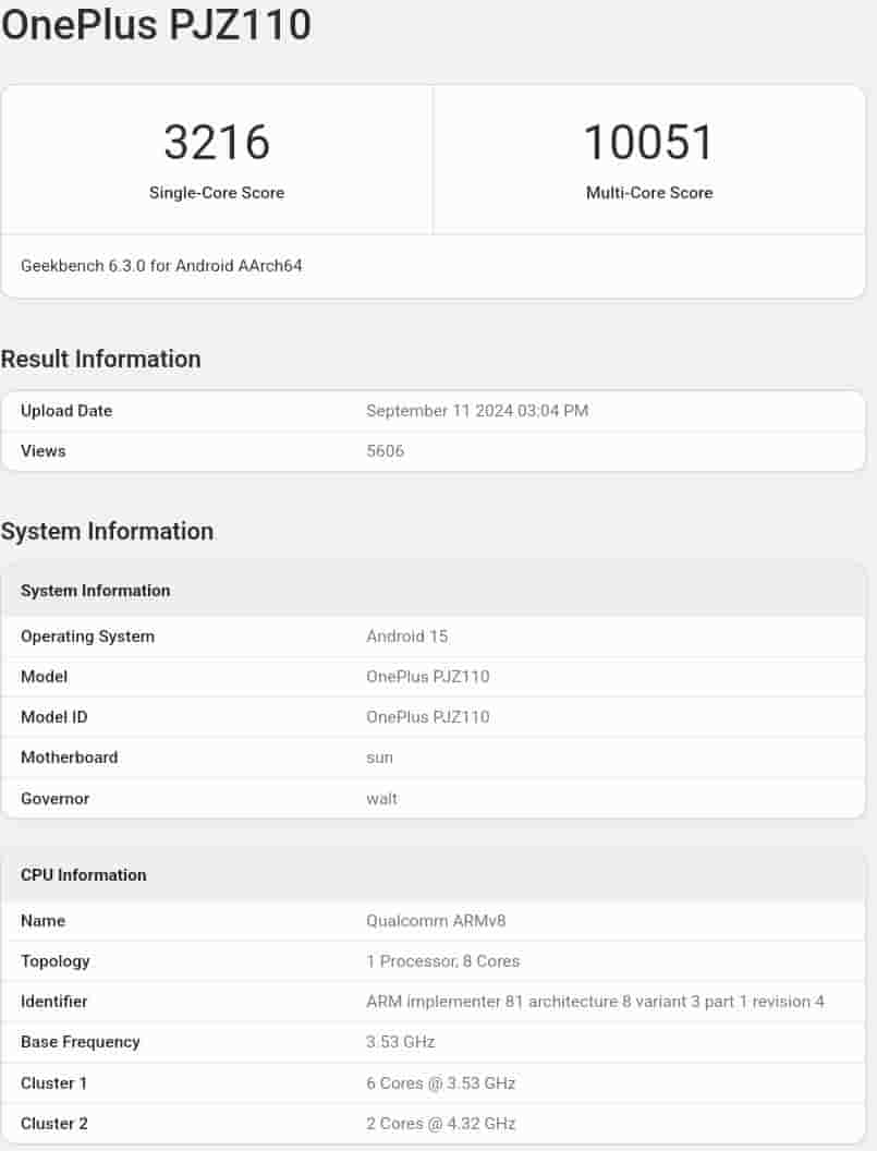 The one tested on a manufacturer model received a 2884 single-core score and an 8840 multi-core score. It comes with two cores clocked at 4.09GHz and six cores clocked at 2.78GHz while the other variant was tested with OnePlus PJZ110 (alleged OnePlus 13), it received a 3216 single core score and 10051 multi-core score and comes with two cores clocked at 4.32GHz and six cores clocked at 3.53GHz.