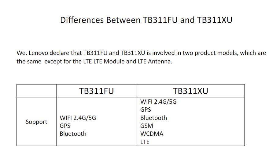 Upcoming Lenovo Tab TB311FU(Wi-Fi Only) and TB311XU(4G) – FCC and TDRA Certifications