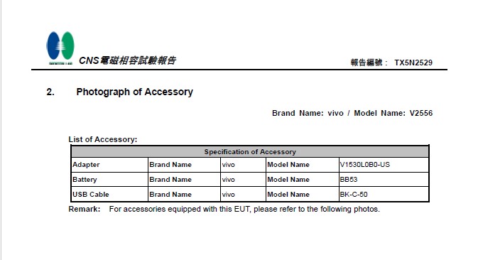 The earlier TUV certification mentioned support for 15W fast charging, and the NCC listing supports this by listing the power adapter model V1530L0B0-US, which corresponds to a 15W fast wired charger and is the same adapter bundled with the Vivo Y04. The NCC documentation also includes battery information, listing the battery model BB53 with a rated capacity of 6,355mAh and a typical capacity of 6,500mAh, compared to the 5,500mAh battery found in the Vivo Y04. In addition, the certification mentions the Vivo BK-C-50 accessory, which refers to an original Vivo USB Type-A to Type-C data and fast charging cable, typically measuring between 1 and 1.2 metres and supporting standard USB 2.0 data transfer.