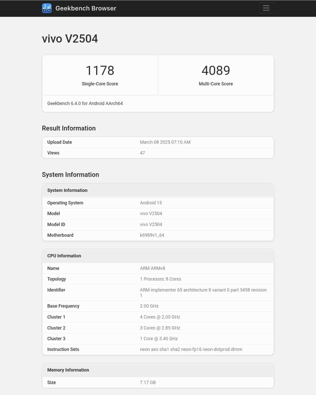 The smartphone will run on Android 15 OS and will arrive with an 8GB RAM option. It has received a 1178 single-core score and a 4089 multi-core score.