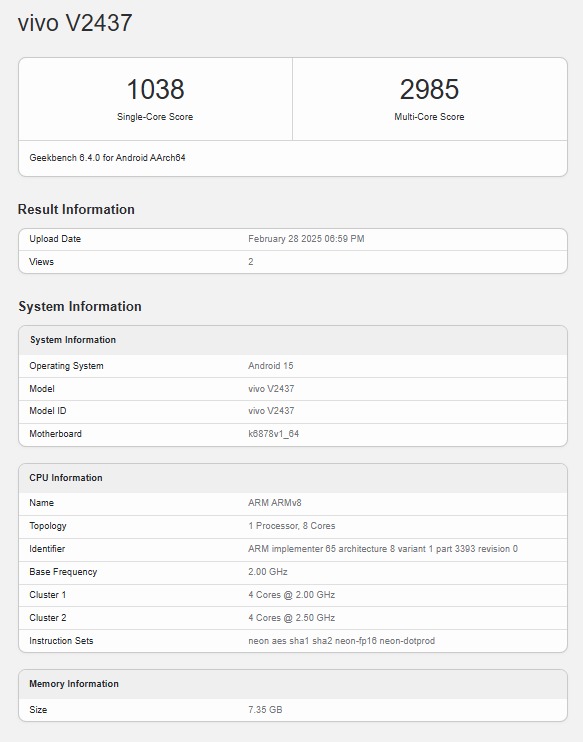 The Vivo T4x 5G smartphone which bears the model number of ‘V2437’ has attained Geekbench scores of 1038 points and 2985 points in the single-core and multi-core tests, respectively. This is the 8GB RAM variant of the device that has been listed, and it is revealed to use the MediaTek Dimensity 7300 chip, integrated with the Mali-G615 MC2 GPU. The device would have the Android 15 operating system out of the box (possibly with the Funtouch OS 15 custom skin on top).