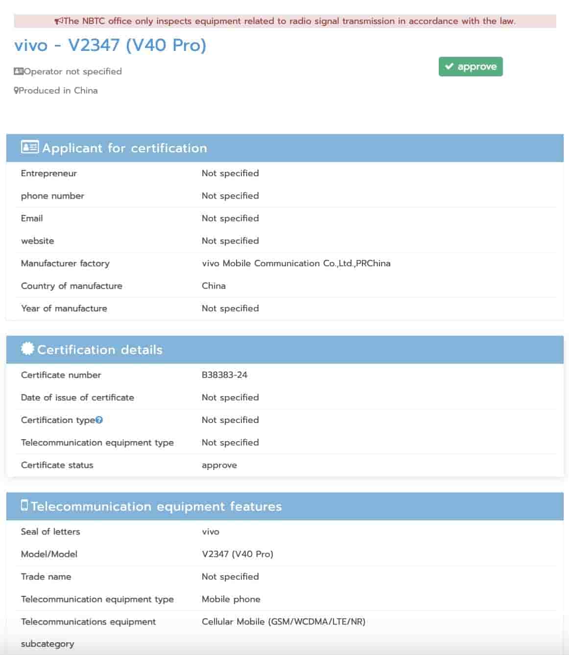 Last month Vivo V40 Pro smartphone was spotted on IMEI and UK’s EE databases with model number V2347. This smartphone has now made its appearance on Thailand’s NBTC certification website.
