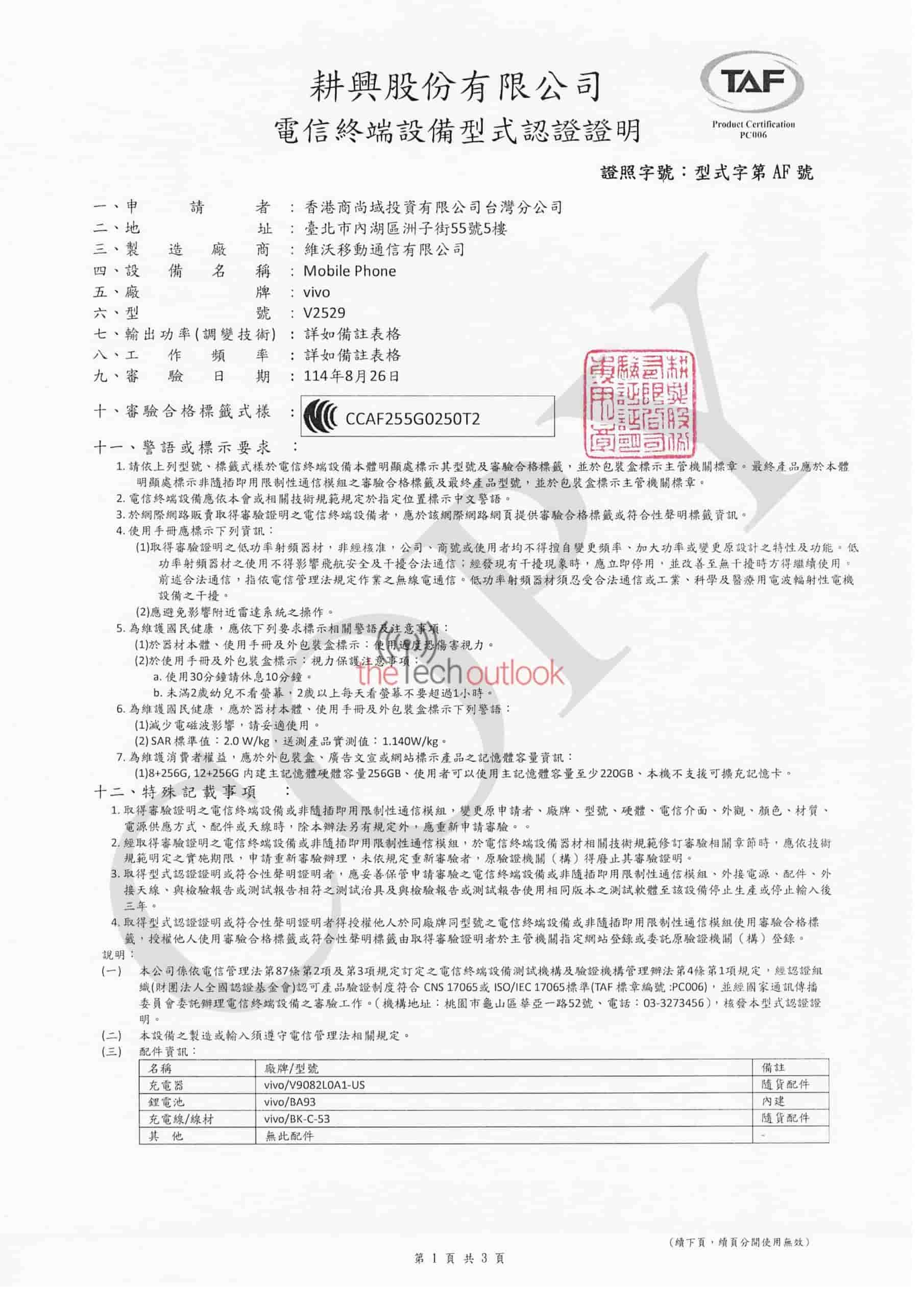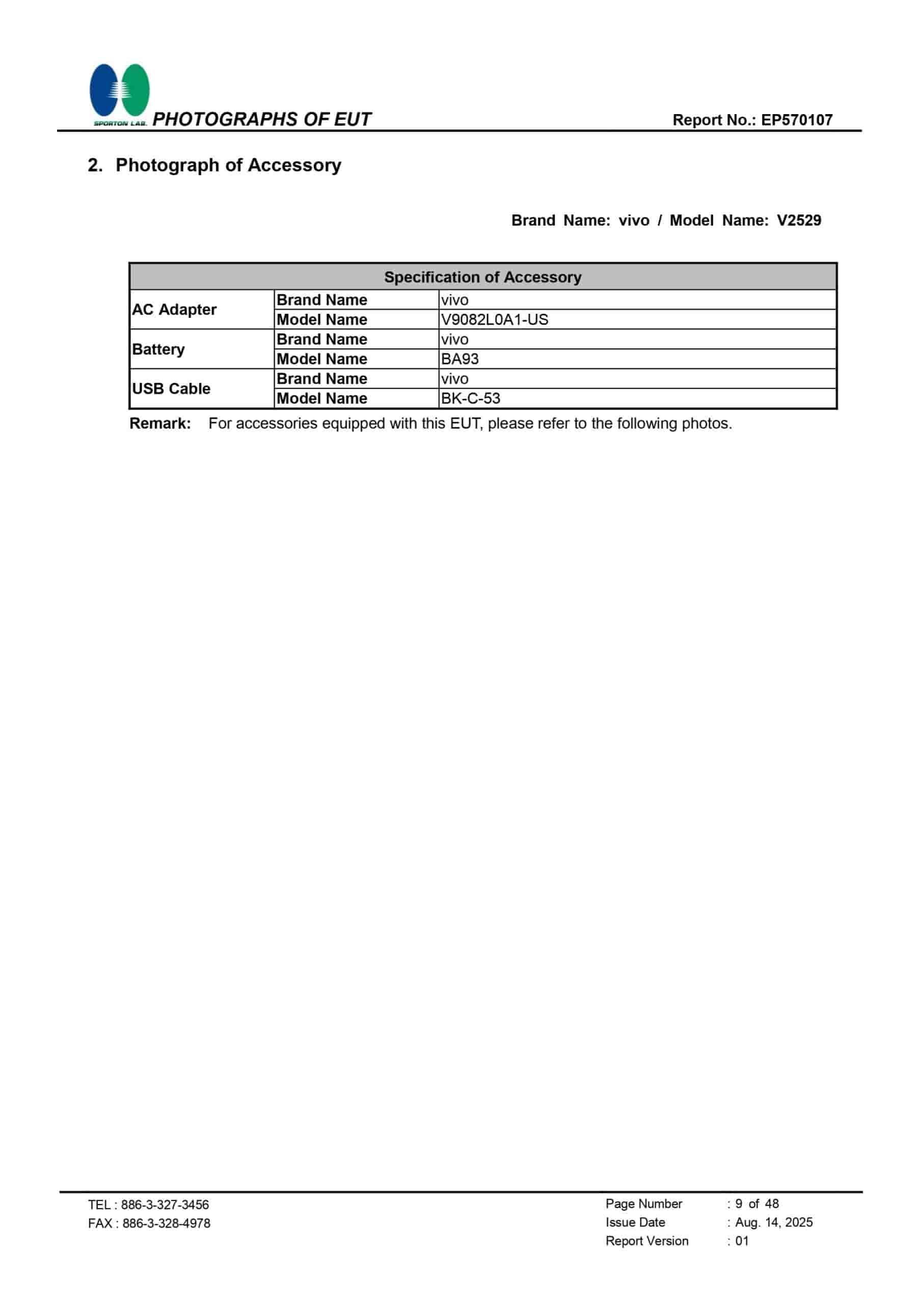 Vivo’s V60 Lite 5G smartphone which carries the model number of ‘V2529’ has received the NCC certification and it has been certified with the inspection and approval number of ‘CCAF255G0250T2’. The listing also reveals the device to support 2G/3G/4G/5G network, dual-band WiFi (2.4GHz + 5GHz), Bluetooth (BR + EDR + LE), and NFC connectivity. Additionally, a charger with the model number of ‘V9082L0A1-US’, battery with the model number of ‘BA93’, and charging cable with the model number of ‘BK-C-53’ are also listed along with the smartphone on the certification database.