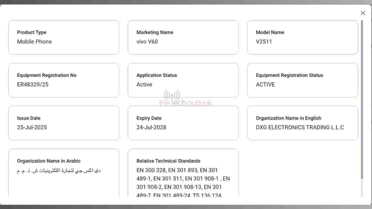 The Tech Outlook has now spotted the Vivo V60 smartphone on the TDRA certification website with model number V2511.