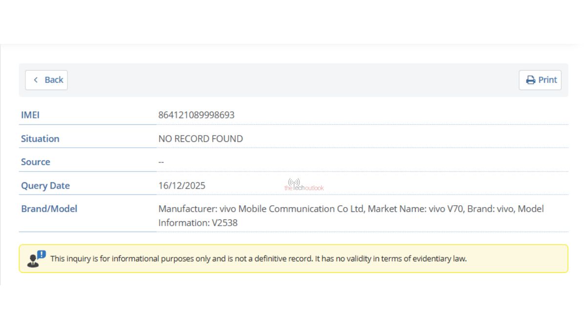 The FCC cerfiication lists the model number “V2538” with the FCC ID as “2AUCY-V2538”, though it doesnt mention the moniker but earlier IMEI listing ha cnfirmed that this model number belong to the upoming Vivo V70. Furthermore, there are seevral IMEI numbers shared in the FCC document as well, and upon checking the same on the IMEI databse also reveals the moniker as Vivo V70.