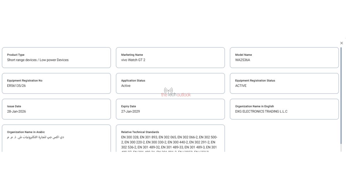 Our team at The Tech Outlook has now spotted Vivo Watch GT 2 (Bluetooth version) on the TDRA certification website with model number WA2536A.