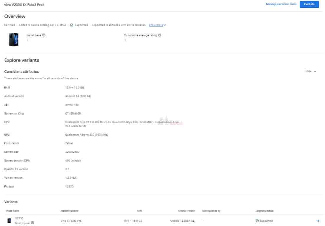 It has been listed with the model number “V2330” and the moniker as X Fold 3 Pro. This model number was also spotted on the Indonesian telecom authorities SDPPI and TKDN, as well as Bluetooth SIG. Returning to the Google Play Console listing, it shows that the system on chip has a model number “QTI SM8650”, which corresponds to the Snapdragon 8 Gen 3 SoC paired with Adreno 830 (903MHz) and 16GB RAM. It has a base core clocked at 3.3 GHz, five cores clocked at 3.2 GHz, and two cores at 2300 MHz. The listing also indicates that it will run on Android 14-based FuntouchOS 14, though the specific version of FuntouchOS 14 is not listed. The screen size is listed as 2200×2480 pixels with a screen density of 480 (xxhdpi).