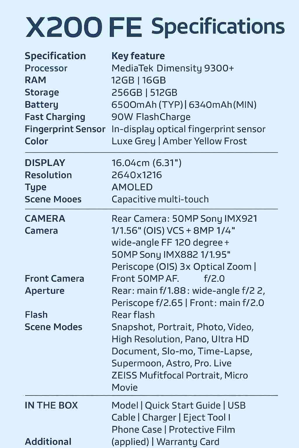 Vivo X200 FE Indian variant is revealed to arrive with 12/256GB and 16/512GB storage options. Other than the smartphone, users will get a quick start guide, USB cable, charger, eject tool, phone case, and warranty card inside the box.