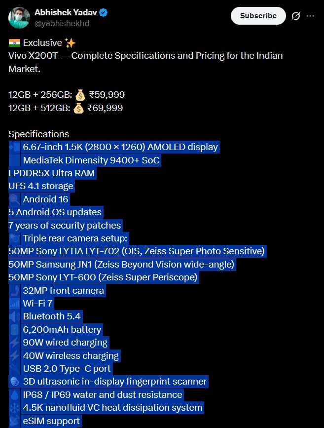 In a post on X, tipster Abhishek Yadav reveals that the Vivo X200T will arrive in two memory options of 12GB+256GB and 12GB+512GB. While the former is said to be priced at ₹59,999, the latter, as per him, is going to be priced at ₹69,999. In his post, he did not mention whether this pricing is after discounts or launch offers, or if it is the sale price before offers.