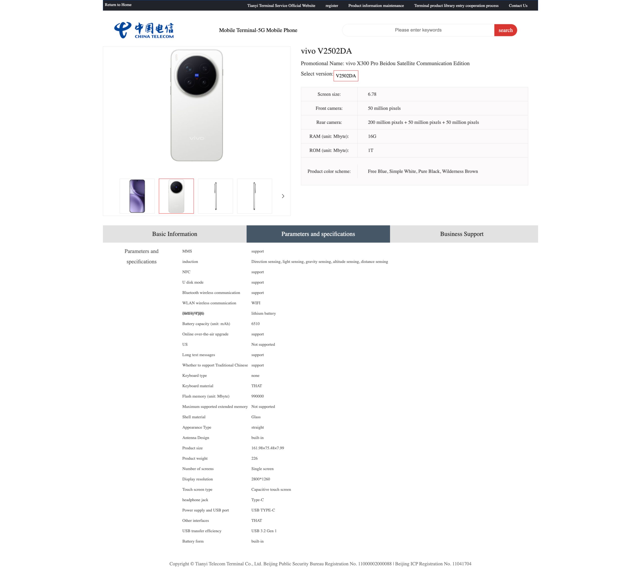 As for memory configurations, the Vivo X300 will come in 12GB + 256GB, 12GB + 512GB, 16GB + 256GB, 16GB + 512GB, and 16GB + 1TB variants. Meanwhile, the Vivo X300 Pro will be available in 12GB + 256GB, 16GB + 512GB, and 16GB + 1TB options. There’s also a Vivo X300 Pro Beidou Satellite Communication Edition (V2502DA), which shares the same specifications as the standard X300 Pro but comes only in a 16GB + 1TB variant.