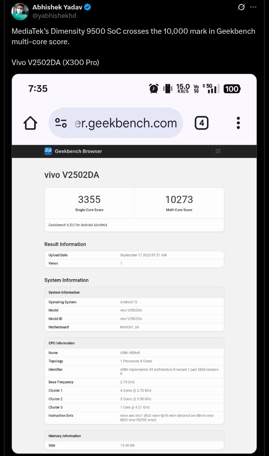Vivo X300 Pro (V2502DA) Geekbench Listing Reveals 10,000+ Multi-Core Performance Test Score: Dimensity 9500 Chip, Android 16 OS, and 16GB RAM Option Also Pointed Out