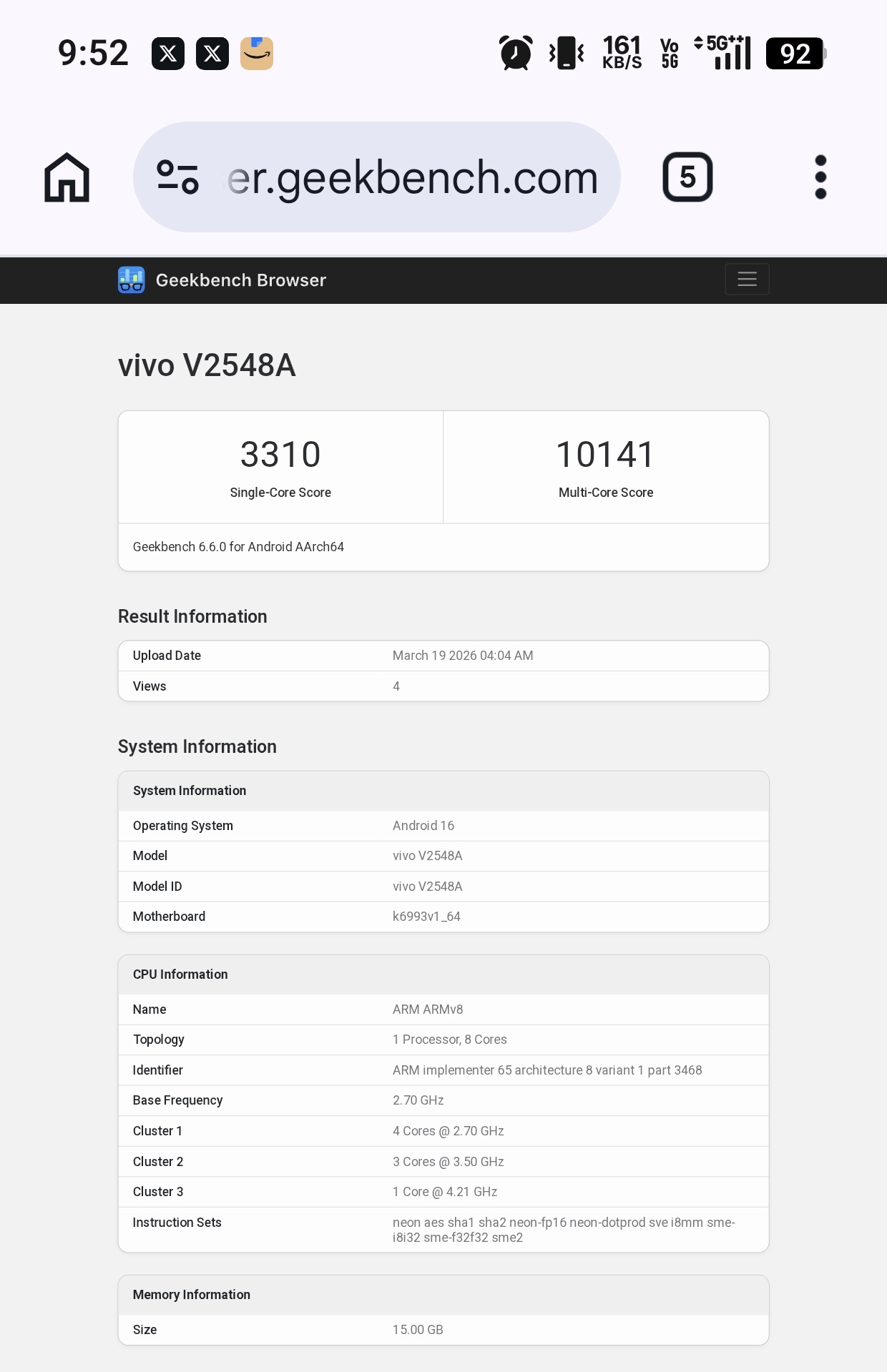 The device received a 3310 single-core score and 10141 multi-core score. It was spotted with an octa-core processor that includes four cores clocked at 2.70GHz, three cores clocked at 3.50GHz and a primary core clocked at 4.21GHz. The chipset is paired with the Mali-G1-Ultra MC12 GPU. These details suggest that the smartphone could be powered by MediaTek Dimensity 9500 SoC.