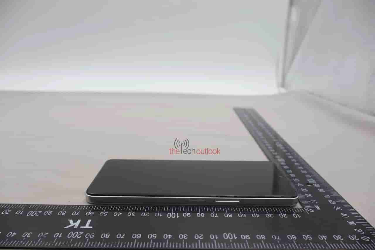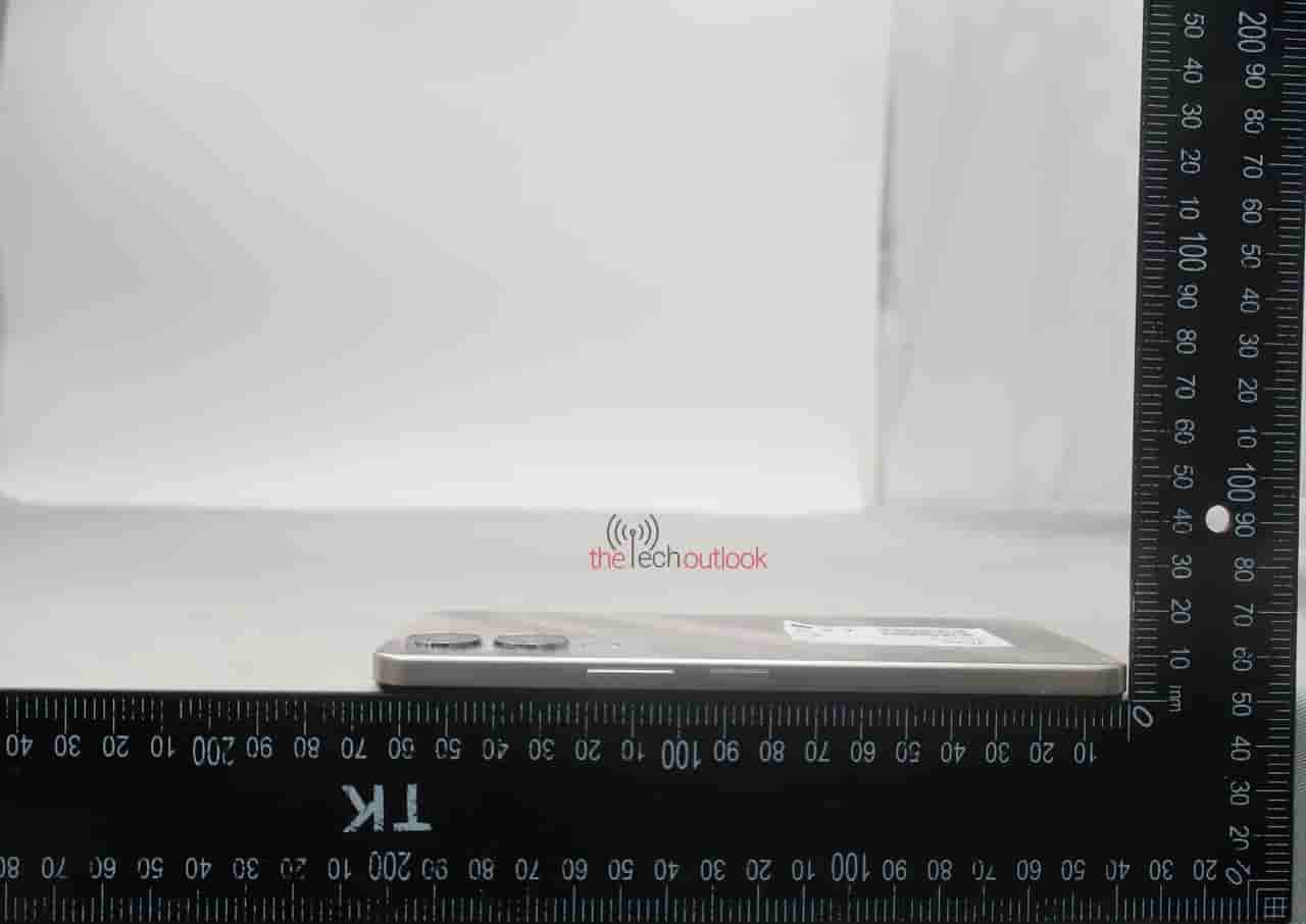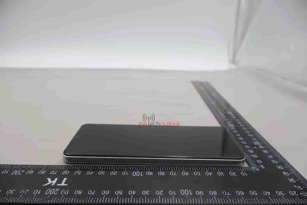 Speaking of its live images, the device is revealed to feature a flat display with a V-like notch, thin bezels, and a slightly more thicker chin. At the bottom of the smartphone, we can find the microphone hole, USB Type-C charging interface, and a 3.5 mm headphone jack. The speaker holes can be found at the top. The volume rocker and power button are placed on the right side panel. Also to note, the power button also seems to be an integrated side-mounted fingerprint scanner too. At the left side panel, there is the card tray at the top portion.