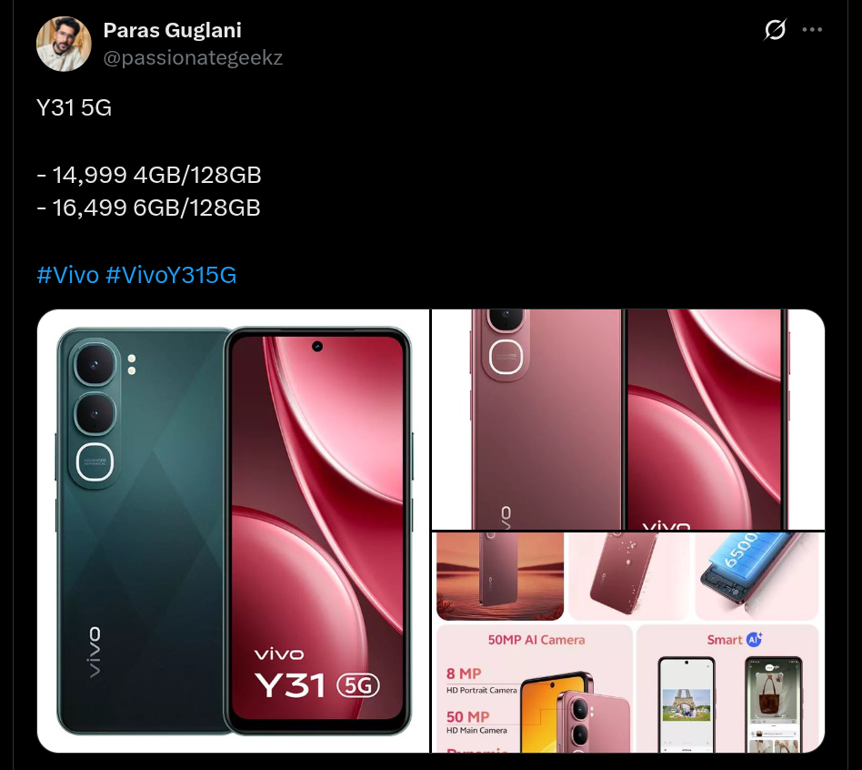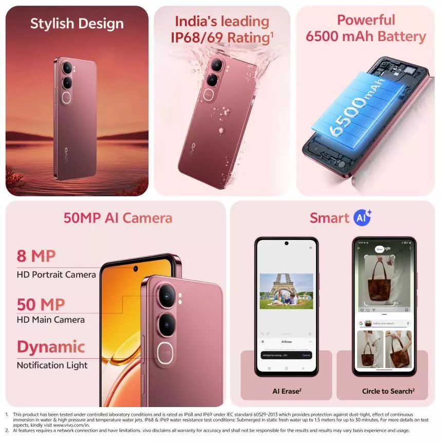Vivo’s Y31 5G is going to feature the same design as that of the Y21d, notably with an overall flat form factor, pill-shaped vertically-placed rear camera module housing two camera sensors and a ring LED light (dynamic notification light), along with a display sporting thin bezels (on three sides), thicker chin, and a punch-hole centrally-placed selfie camera. It will also have an IP68/69-rated protection and is going to pack a 6500 mAh battery similar to the Vivo Y21d device. Furthermore, at the rear, a 50MP HD main camera is given and for selfies, an 8MP HD portrait front-facing camera is there. Smart AI features are also part of the device, and its users will be offered AI Erase and Circle to Search capabilities.