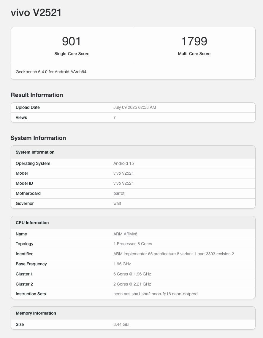 Coming to the Geekbench listing, the Vivo Y31 5G has achieved 901 points and 1799 points respectively on the single-core and multi-core tests. Speaking more, the Geekbench database reveals the existence of a 4GB RAM variant too for the upcoming device, in addition to the Android 15 operating system and Adreno 613 GPU. Looking at its Qualcomm Snapdragon chip, unlike the details listed on Google Play Console, two of its cores are clocked at 2.21 GHz, and the other six cores at 1.96 GHz.