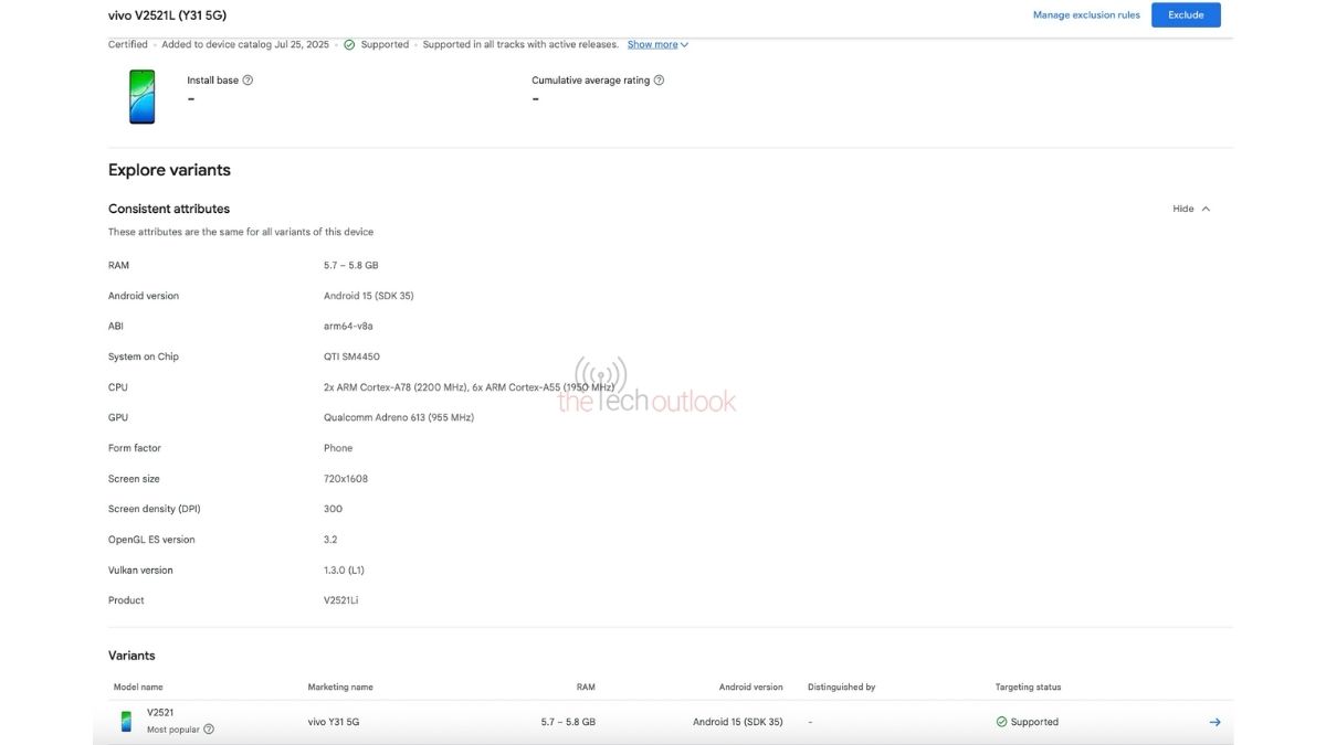 The upcoming Vivo Y31 5G smartphone carries the model number of ‘V2521’, and its 6GB RAM variant has been listed on the Google Play Console database. Specs such as Android 15 operating system, 2.20 GHz-clocked Qualcomm Snapdragon processor (2x Cortex A78 cores clocked at 2.20 GHz + 6x Cortex A55 cores clocked at 1.95 GHz), Adreno 613 GPU, and 720 x 1608 pixels resolution display with 300 DPI screen density have been revealed for the device.