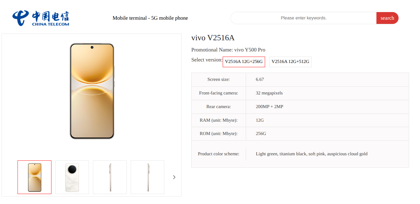 Coming to its China Telecom listing, the Vivo Y500 Pro device which carries the model number of ‘V2516A’ is revealed to be made available in two storage options (12GB/256GB, 12GB/512GB) and four color choices (Light Green, Titanium Black, Soft Pink, Auspicious Cloud Gold). Also, in addition to the 200MP main camera at the rear, a 2MP additional camera will also be present. For selfies, a 32MP front-facing camera is also given on the device.