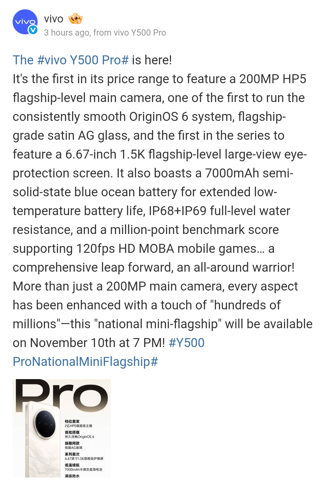Vivo’s Y500 Pro is teased to hit the Chinese market as the very first smartphone in its price range to offer a 200MP HP5 flagship-level main camera, and it will be running on the Android 16-based OriginOS 6 custom skin. Flagship-grade satin AG glass, 6.67″ 1.5K flagship-level large-view eye-protection display, 7000 mAh semi-solid-state low-temperature Blue Ocean battery, and an IP68+IP69 full-level water resistance are projected as its other notable specs. In terms of gaming, the device is teased to offer 120fps HD MOBA mobile gaming experience, and it has achieved a million points on the benchmark platform.
