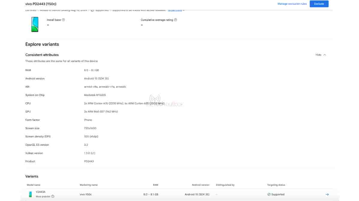 The Vivo Y50c smartphone carries the model number of ‘V2443A’ as per the Google Play Console database, however on the Google Play Console Supported Devices List, it was spotted with the model number of ‘V2443BA’. It is the 8GB RAM variant of the device that has been listed, and it is revealed with key specs such as the MediaTek Dimensity 6300 processor (MT6835, 2.20GHz, octa-core), ARM Mali G57 GPU, Android 15 OS, and 720 x 1600 pixels resolution display with 320 xhdpi screen density.