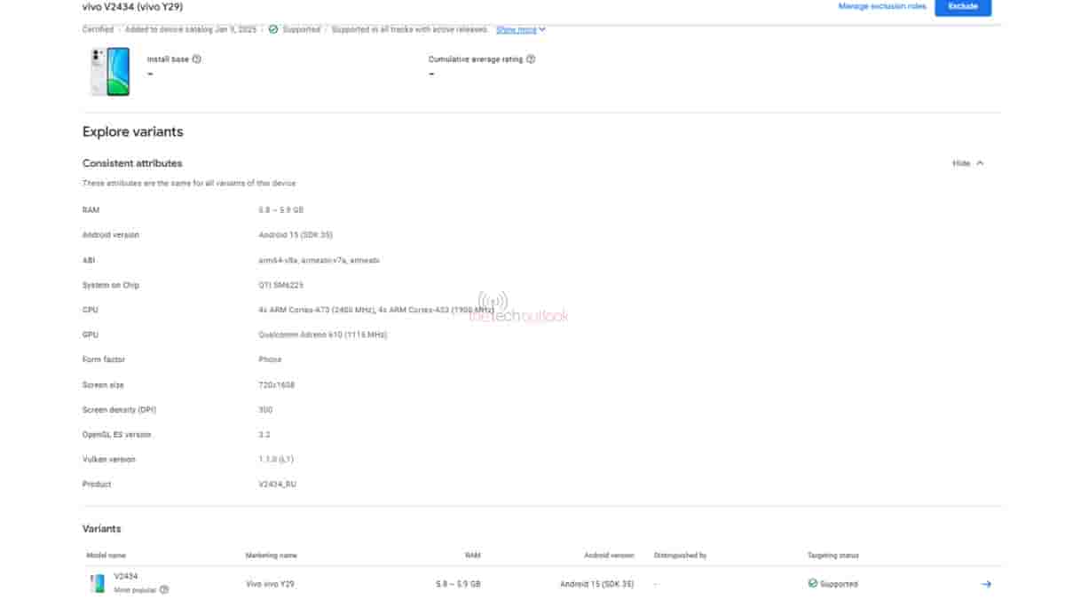 The Vivo Y29 4G has already made its appearance on a few certification databases previously and now, it has appeared on the Google Play Console Supported Devices List. Via its listing, few key specs and its render image have also been revealed.