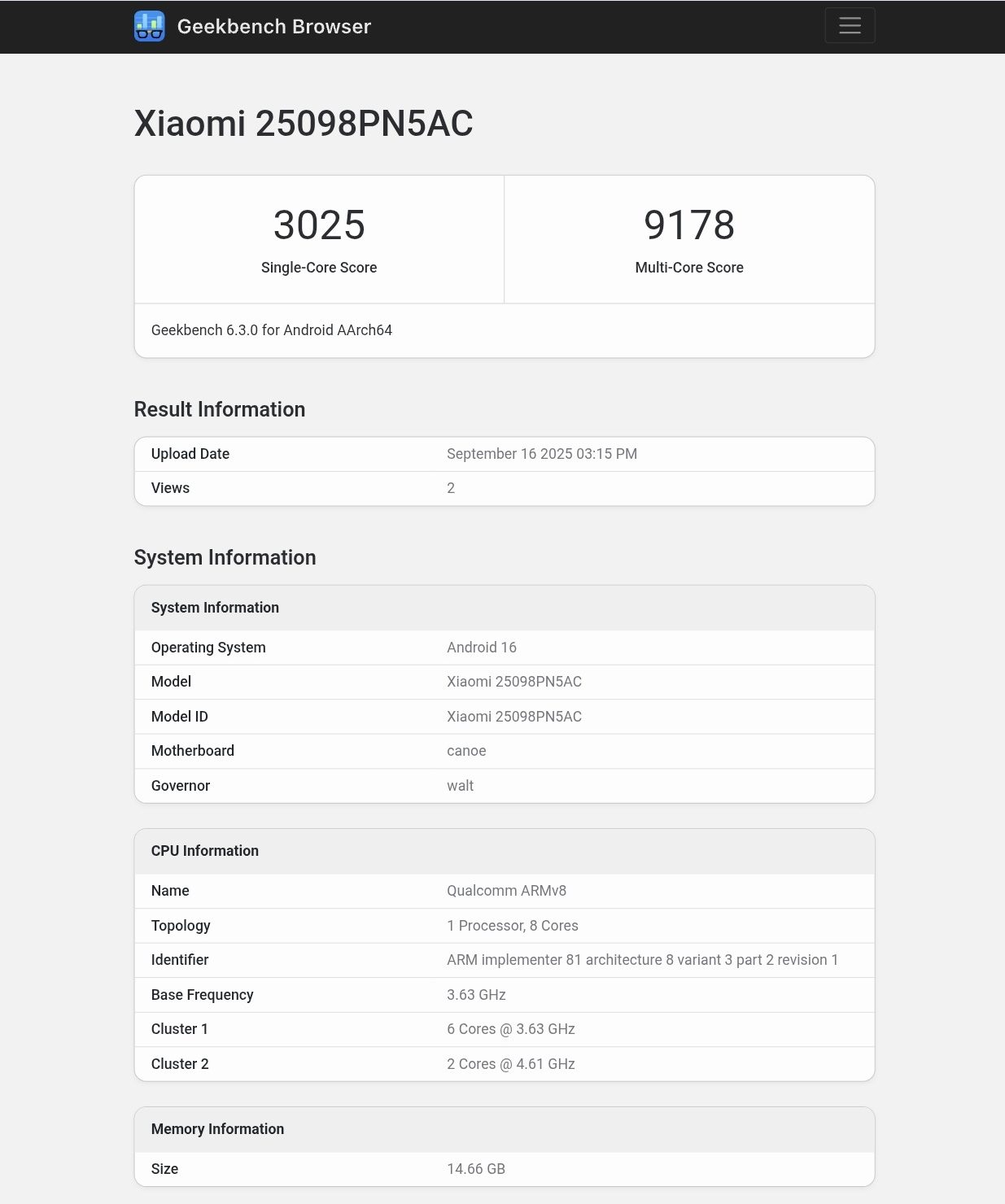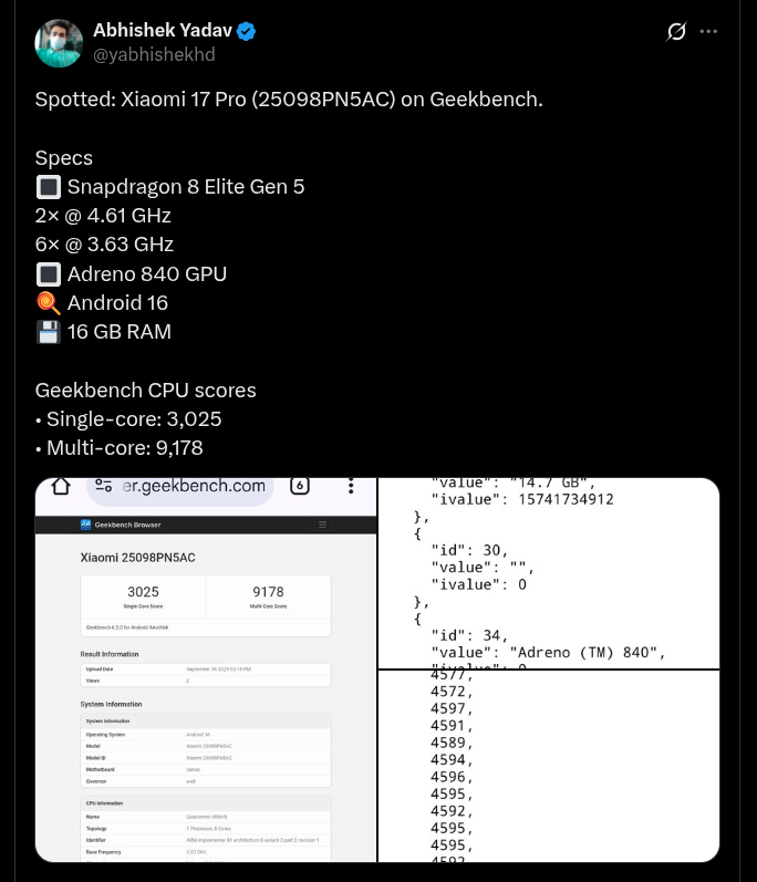 Xiaomi 17 Pro (25098PN5AC) Appears on Geekbench, Revealing Snapdragon 8 Elite Gen 5 chip, Android 16 OS, 16GB RAM Option, and More