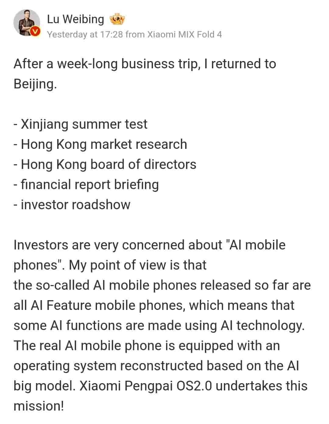 Xiaomi Group President, Lu Weibing has shared an important update related to the upcoming Xiaomi HyperOS 2.0 on Weibo.