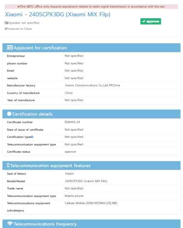 This upcoming flip phone from Xiaomi is listed with the certificate number “B38400-24” and model number “2405CPX3DG”. Unlike the IMDA listing, the moniker “Xiaomi Mix Flip” appears on this certification. The letter “G” at the end signifies the global audience. This is probably an early listing, as there are numerous spelling errors, and the date of approval isn’t listed yet. However, it does hint at Xiaomi’s plan to launch this flip phone in the global market as well.
