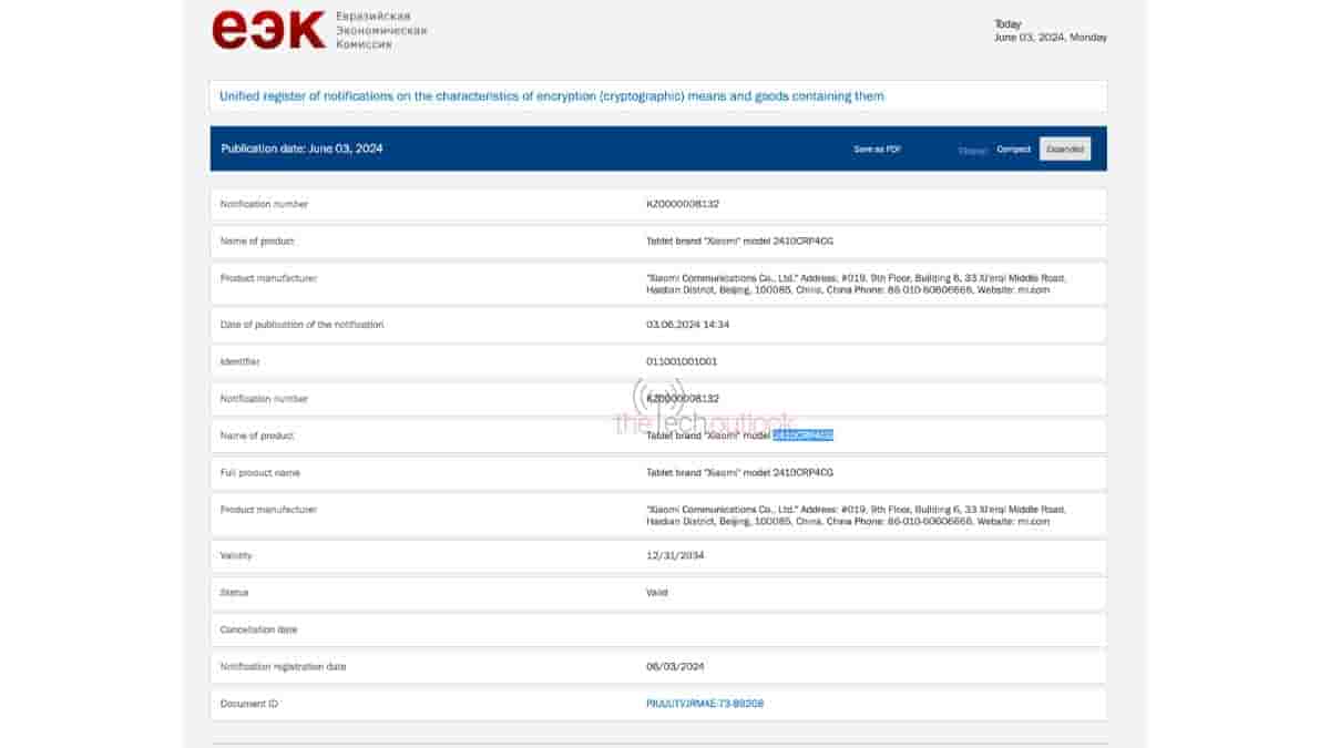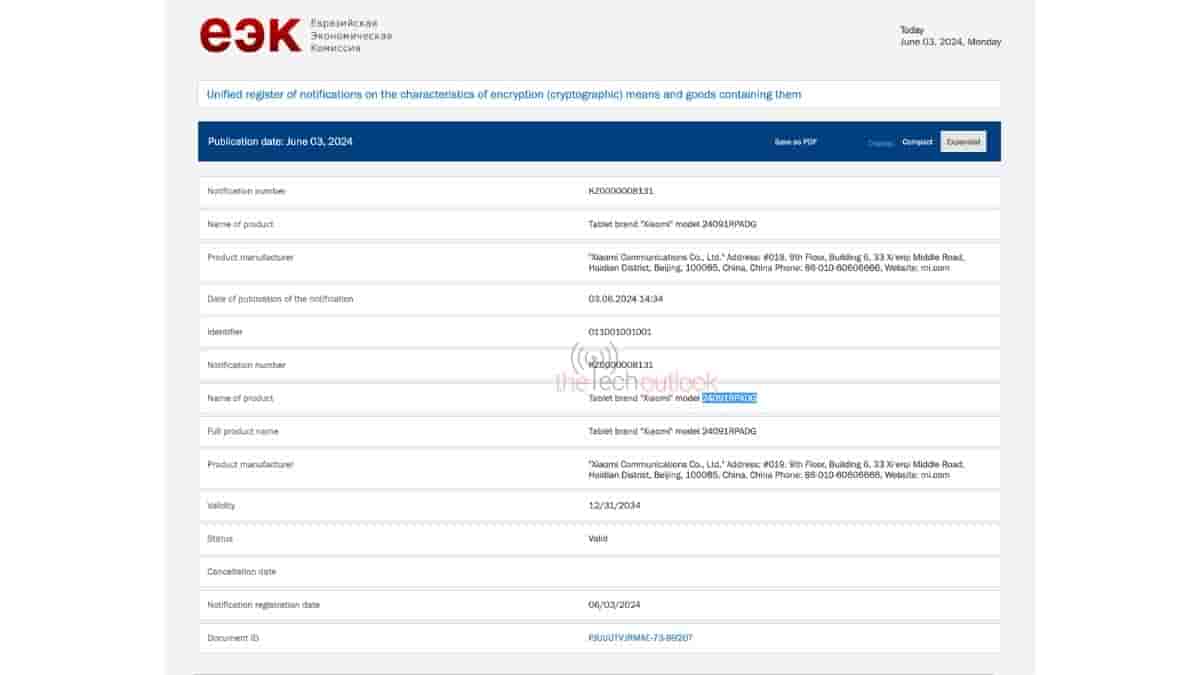 Two devices under the brand name Xiaomi have also been found listed on the EEC Certification websites that are its upcoming tablets. These tablets have appeared with the model numbers 2410CRP4CG, and 24091RPAD though the listing does not confirm the moniker. Recently XIAOMITIME spotted Xiaomi Pad 7 and Xiaomi Pad 7 Pro in HyperOS code with the code names “uke” and “muyu” respectively. The report says that 2410CRP4CG can be associated with the Xiaomi Pad 7 Pro while the 24091RPAD with the Xiaomi Pad 7. Earlier the pro version of the tablet series was expected to be associated with the model number 24018RPACG.