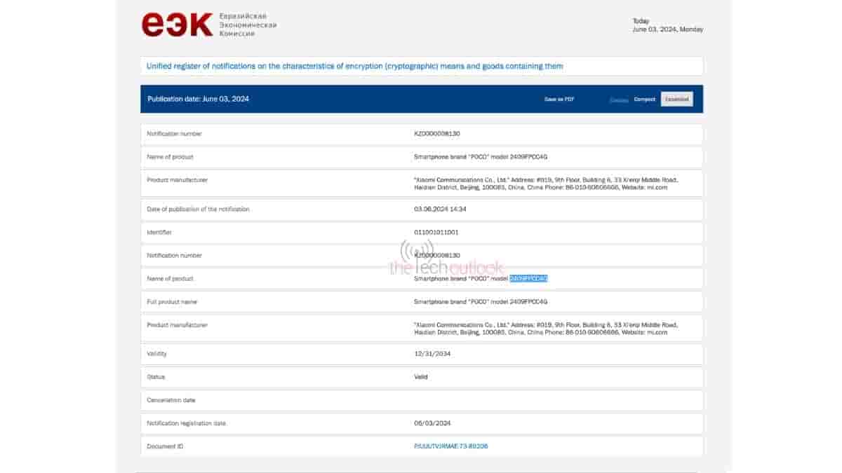 A device with the model number 2409FPCC4G has appeared on the EEC certification website under the brand name POCO and product name smartphone. The moniker could not be confirmed by the certification through the listing though the smartphone model number hints that the smartphone can be launched around October month of this year. This model number has earlier not reported to have appeared on any other certification website so a lot remains under the wrap.